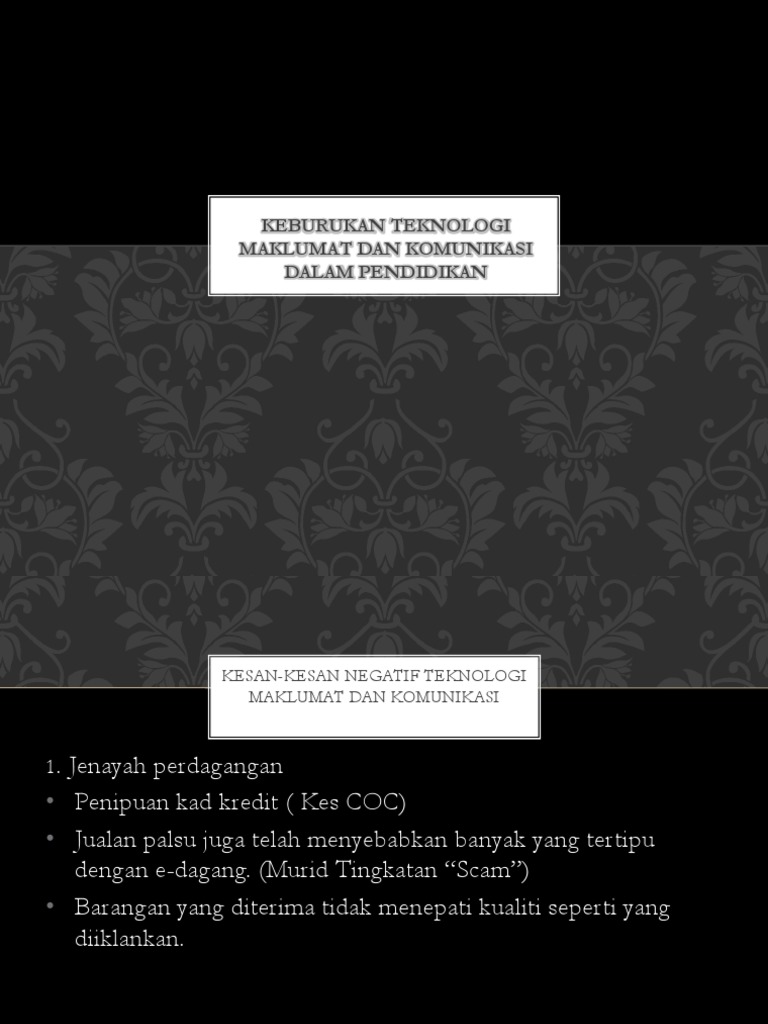 Kesan positif dan negatif penggunaan internet dalam kalangan pelajar. Begitu juga dengan teknologi maklumat dimana terdapat kesan yang negatif dan positif terhadap penggunaannya. Ia boleh berkenaan denagan segala aspek dalam pengurusan dan pemprosesan maklumat. Iklan menyampaikan maklumat dan mesej kepada orangramai. Integrasi teknologi maklumat dan komunikasi dalam. Akses kepada maklumat dan pengetahuan yang dahulunya sukar kini tidak menjadi masalah lagi tanpa disedari. Antara kesan positif ict ialah mudah mendapatkan maklumat. Teknologi maklumat dalam ptv (mbe 13203) 1 ahli kumpulan :satu 1.ahmad annuar 2.bukhari salah satu kesan yang ketara adalah pergantungan kepada bekalan elektrik. Komunikasi yang menembusi hampir ke seluruh pelosok dunia. Jabatan teknologi maklumat dan komunikasi (jtmk) merupakan sebahagian daripada jabatan akademik di politeknik metro tasek gelugor (pmtg). Aduan semua aduan kerosakan ict, pertanyaan, cadangan dan maklumbalas sila isi di sistem aduan dan sebarang khidmat nasihat ict boleh merujuk kepada pegawai bahagian perkhidmatan ict atau pusat teknologi maklumat universiti kebangsaan malaysia 43600 ukm bangi, selangor. Hal ini adalah sangat penting kerana dapat mendedahkan pelajar kepada dunia teknologi yang semakin berkembang pesat dan dalam usaha meletakkan. Antara kesan positif penggunaan internet kepada pelajar ialah: